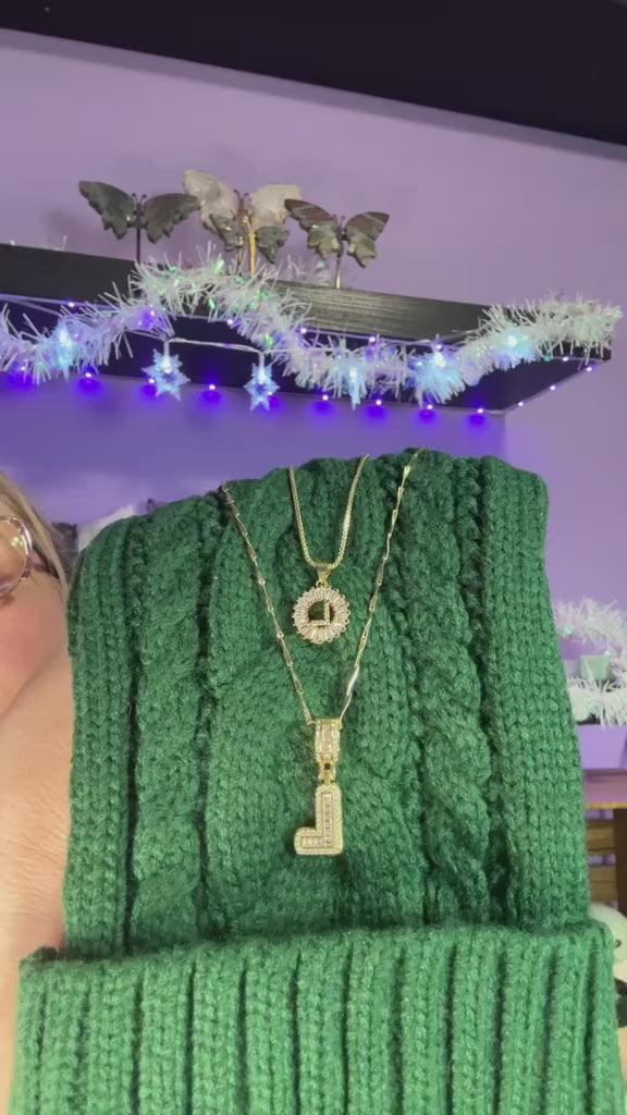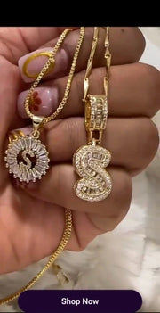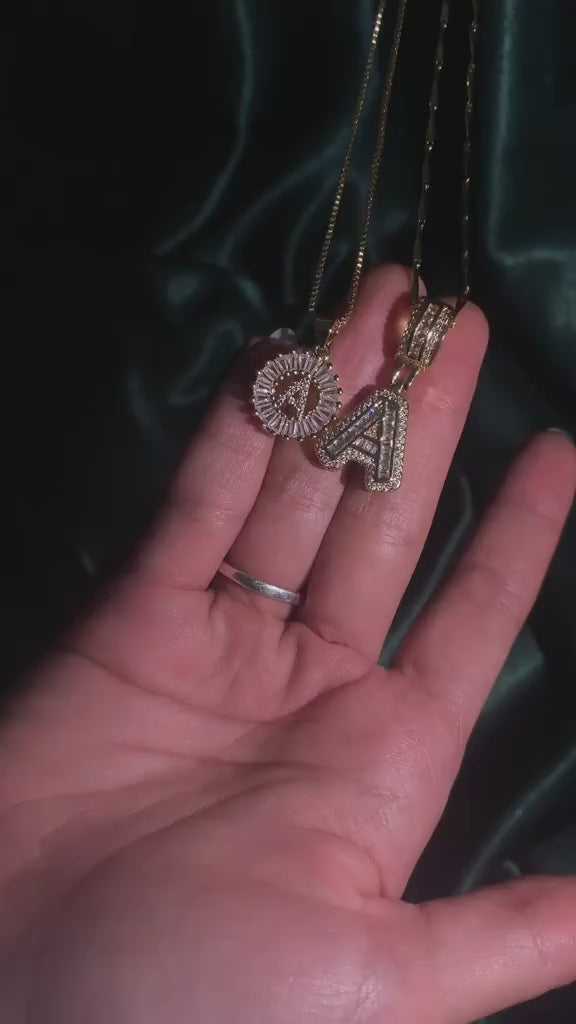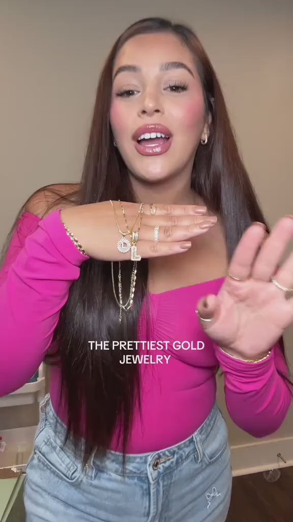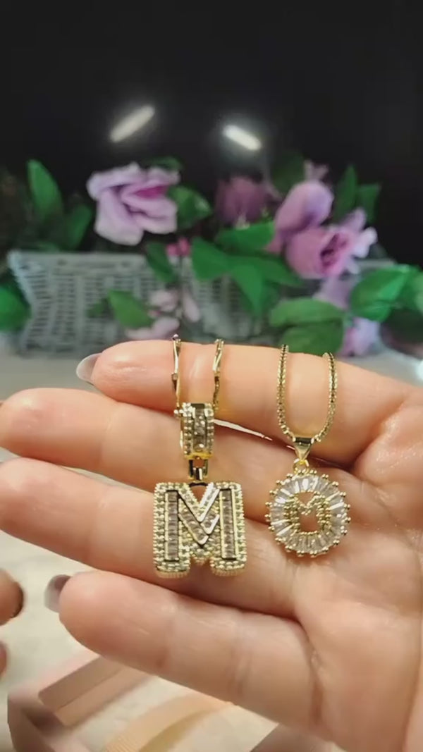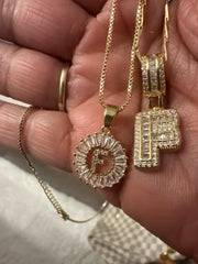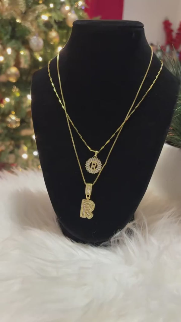- Style: This set includes two complementary necklaces designed for effortless layering:Shorter Necklace: A dainty gold box chain with a baguette diamond circle pendant. At the center sits a delicate paved diamond initial, adding a subtle yet luxurious touch.Longer Necklace: Features a slightly thicker and more structured chain, with a larger diamond initial that creates a bold yet elegant contrast to the shorter piece. The mix of textures and sizes makes this set versatile and eye-catching.